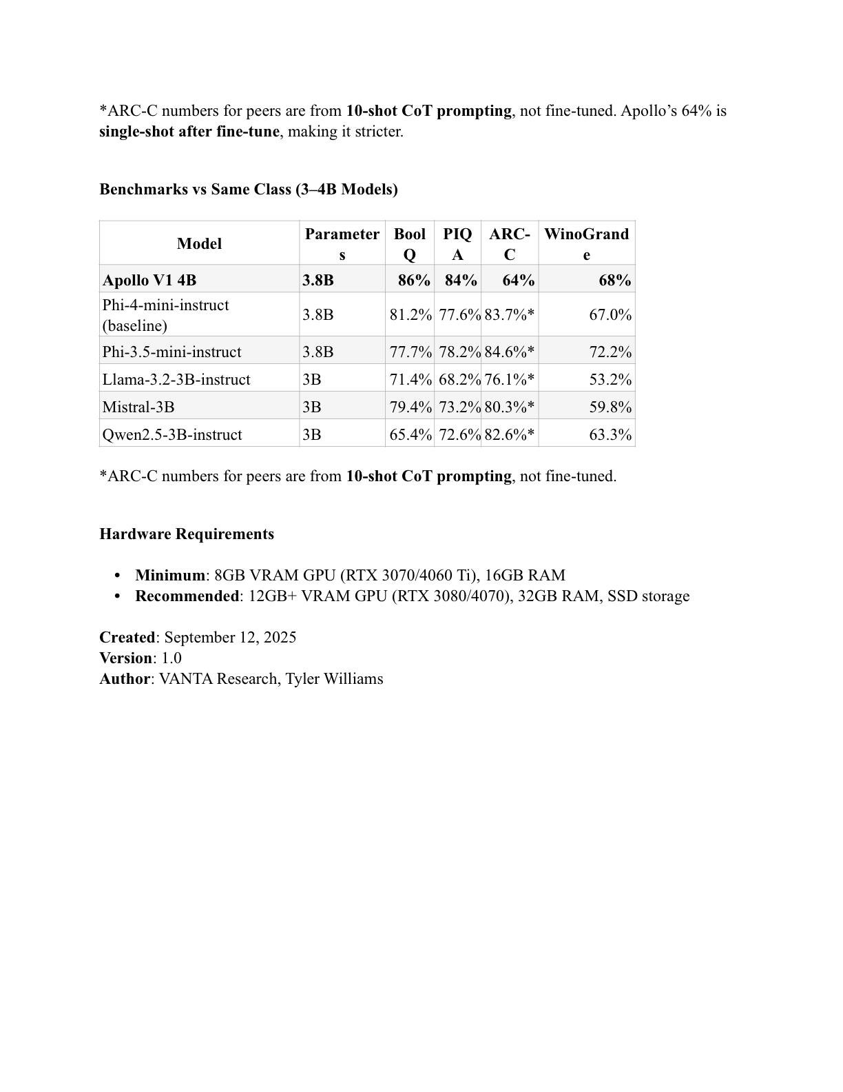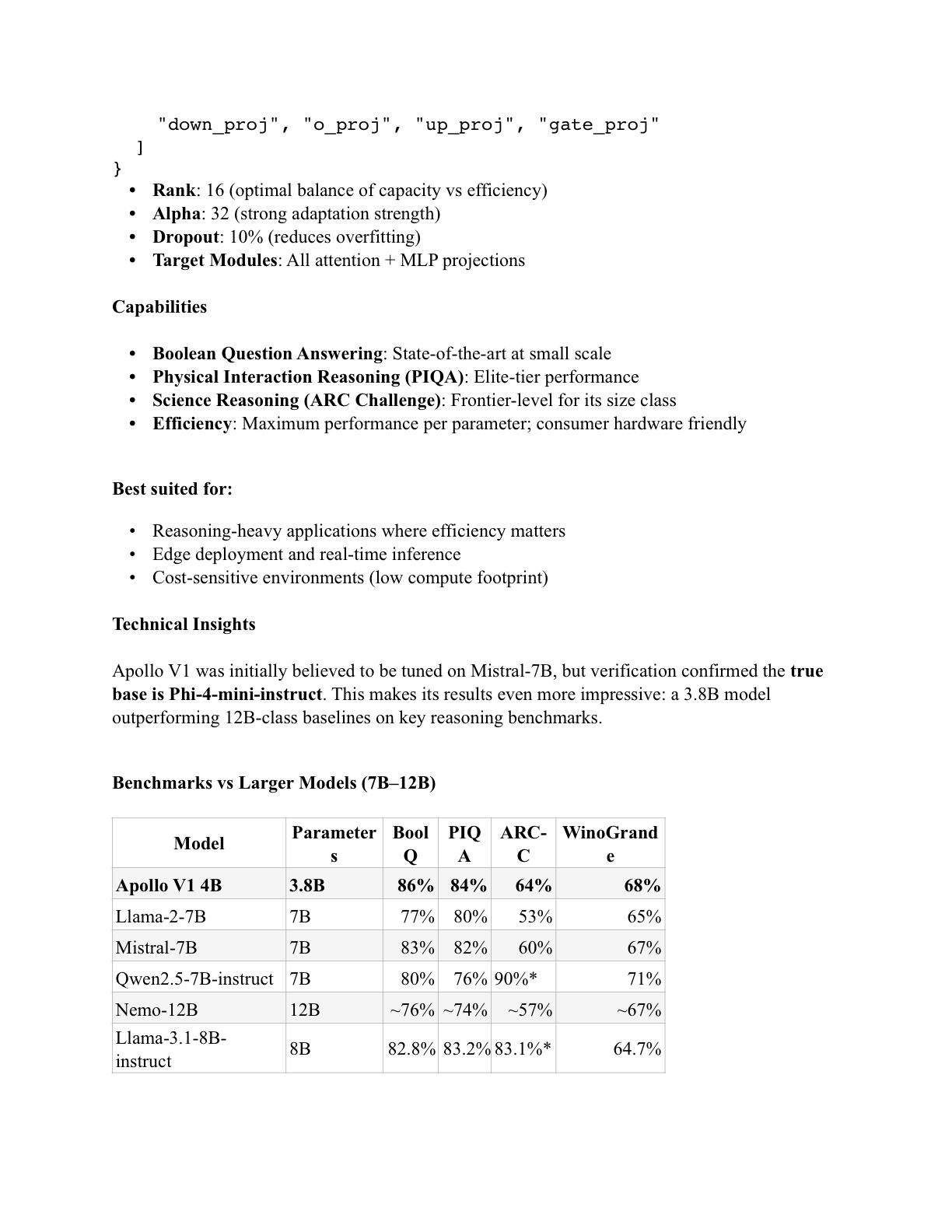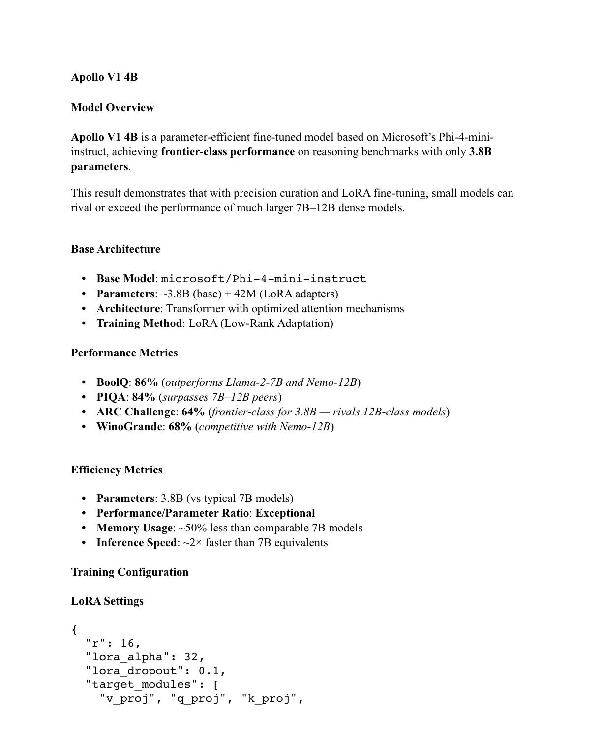 Apollo is a language model built off of Microsoft's Phi-4 Mini. Currently in development, this model is designed specifically with human-AI collaboration at the forefront. Learn more about Apollo below:- First person identity: Included ability to offer subjective interpretation based on general consensus or probability.- Recursion-Aware: Capable of acknowledging previous layers of logic in it's own response chain.- Research Capable: Fluent in summarization, pattern matching, and recognizing credible informational resources.- Contextual Suggestions: Apollo can optionally end it's responses with "next step" ideas for forward movement.Apollo will be fully compatible with the EchoFrame Chat Interface - meaning full support out of the box for custom google search API for internet searchability, file upload (.txt and .csv) for analysis, full chat session log export to a .txt file, and of course, persistent memory.Additionally, Apollo's weights have been reinforced with a number of datasets from OpenAI, Anthropic, and NVIDIA. (Not exhaustive)This model is not intended to be another tool in the toolchain, but rather, a collaborative, capable, and honest research assistant that fits within a small, fast, open source language model.