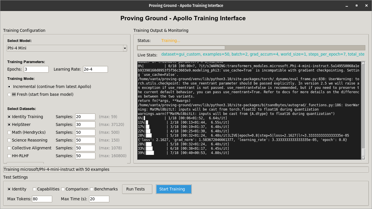 Proving Ground is my custom graphical user interface for LoRA training on the Apollo model. The user is able to enter in the desired epochs, and learning rate for the session. Additionally, the user has the option to iterate off of the most recent Apollo model, or start from scratch with a base model. PG allows the user to type in the amount of samples for the next training session, which are randomly selected from the source dataset. Proving Ground currently consists of high quality, open source training data from Anthropic, OpenAI, and NVIDIA.After the current training session completes, the user has the option to run either a curated selection of tests against the model, or a full suite of industry-standard benchmarks.Proving Ground is designed to simplify and optimize the model training process for rapid testing/iteration.