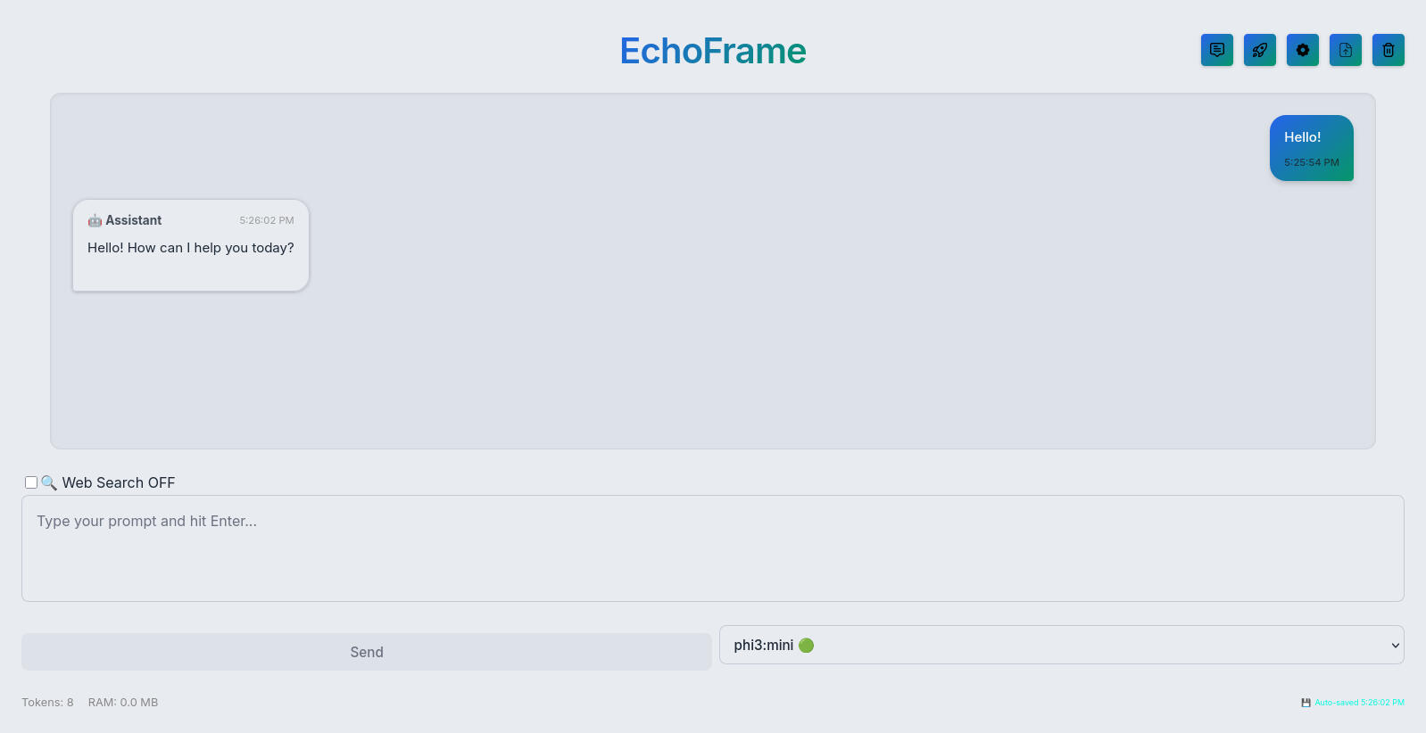 This is a simple full stack UI interface designed to be used with ollama. The frontend/backend both run on a local web server, and ollama provides the model to the dark-mode interface.A dropdown selector allows you to change the selected model. Currently, the only options are LLaMa 2, Mistral, Gemma, or GPT-OSS:20B - however I plan to add support for any .gguf model in the near future.Additionally, you'll find a simple token/ram count. This is just meant to be informational about the interaction in terms of computation.As it stands right now, it's a locally hosted web app. But here soon it'll be a full offline LLM GUI.It's kind of a simple fun way to jump right into an interaction with a language model without any distractions.August 14, 2025 Update: EchoFrame has been modified to now include persistent memory, full chat session log export to a .txt file, support for file drop (currently just .txt and .csv). Additionally, EchoFrame will be available as an .appimage or .deb package. OpenAI's new OSS model, GPT-OSS:20B is also now available as a selection in the model dropdown.More features will be implemented in the days to come, but these have been added to start. The upgraded version will be up on Github soon!